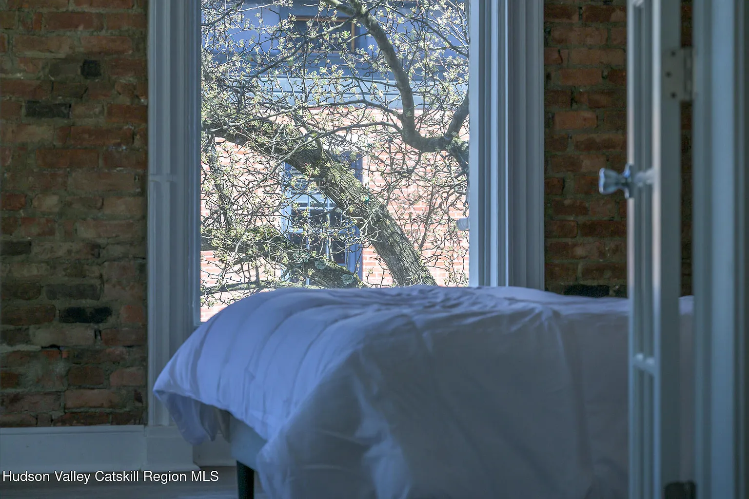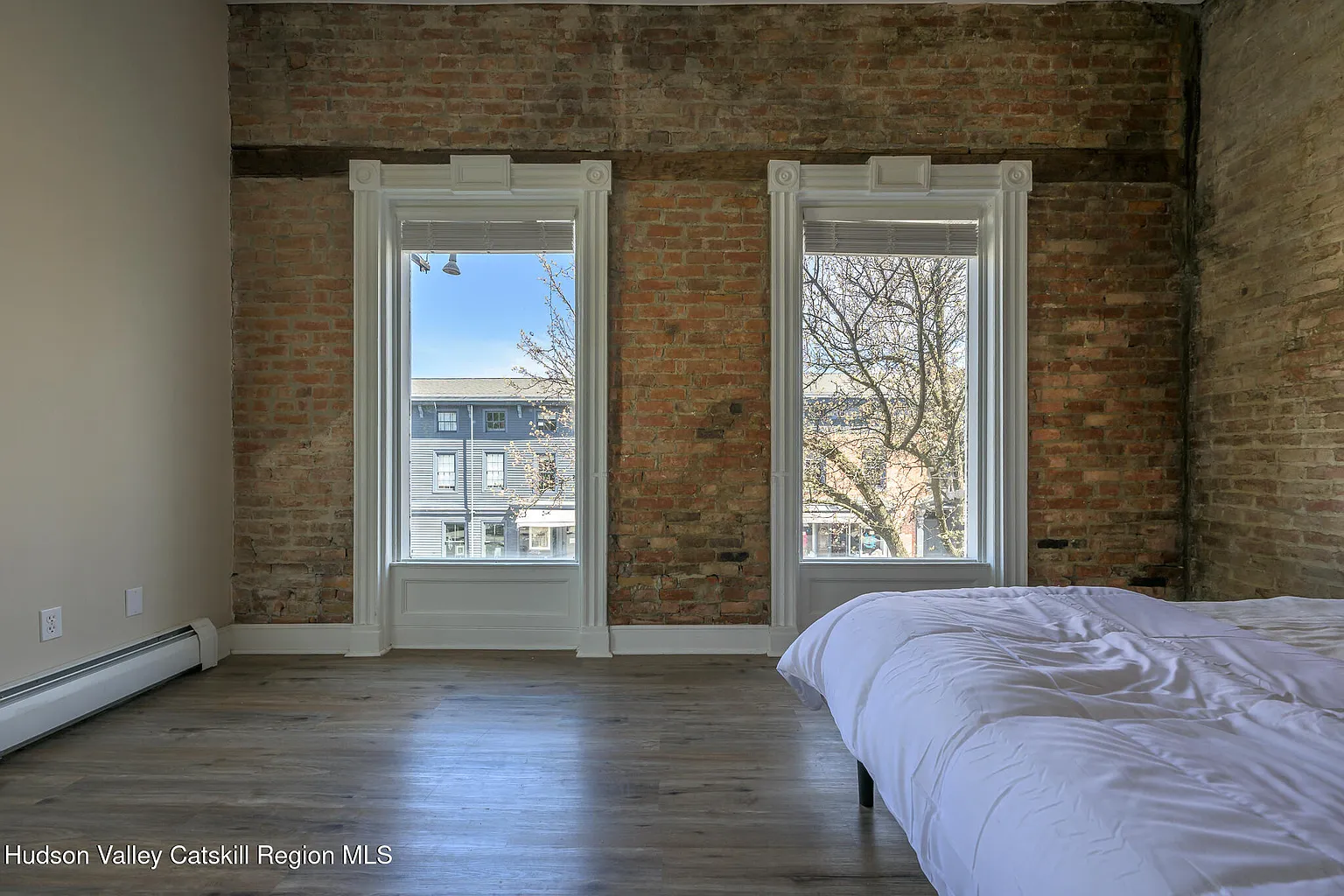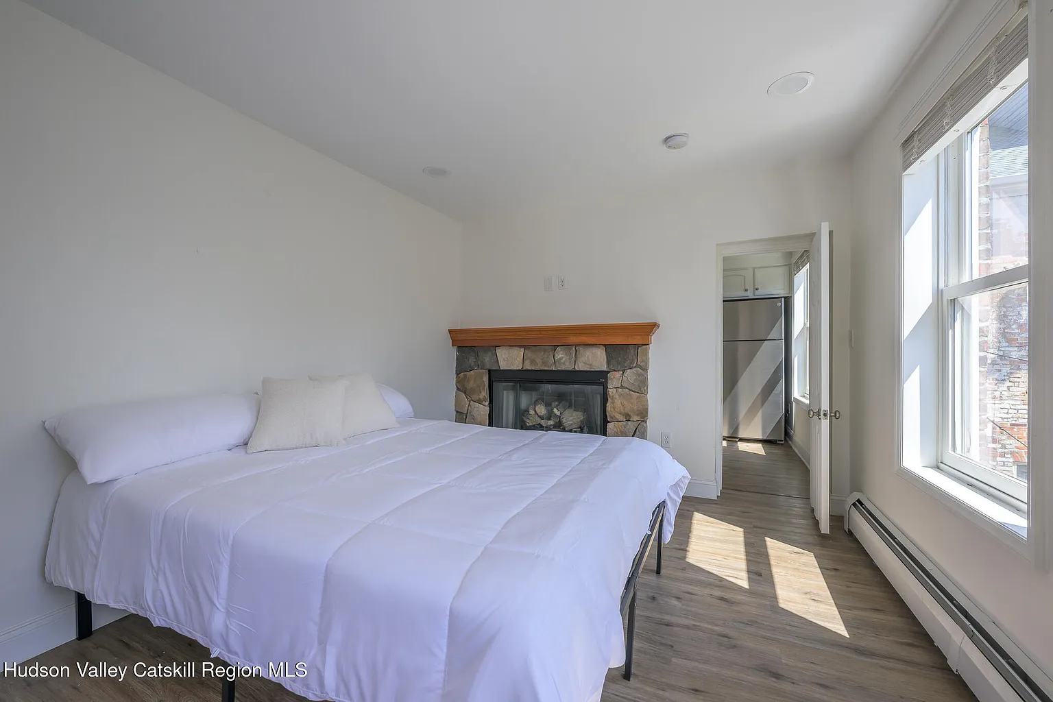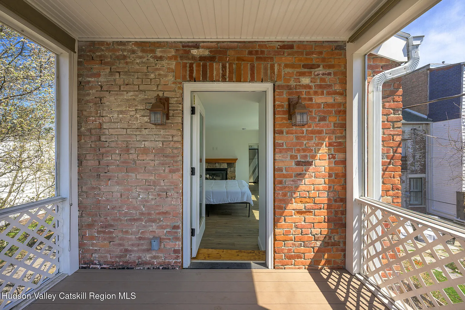 Up the stairs to the 2nd floor, one enters the dining and recreation areas of the apartment. The high ceilings and large windows fill the rooms with light and create a grand double reception, directly overlooking the neighboring park. The stunning brick exposures continue through to the large primary suite at the front. To the rear, one finds the bathroom, kitchen and 2nd bedroom complete with feature stone fireplace. This bedroom contains a laundry nook and opens directly on to the spacious screened deck with its views across the park, the historic houses on Union Street, and the mountains beyond – a perfect place to sit and admire the incredible Catskill sunsets.