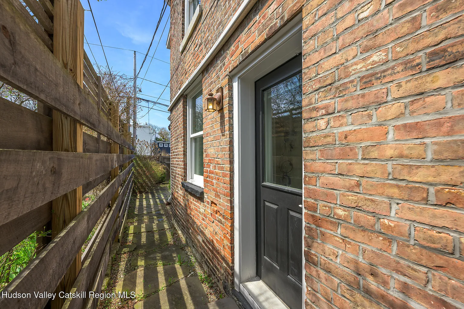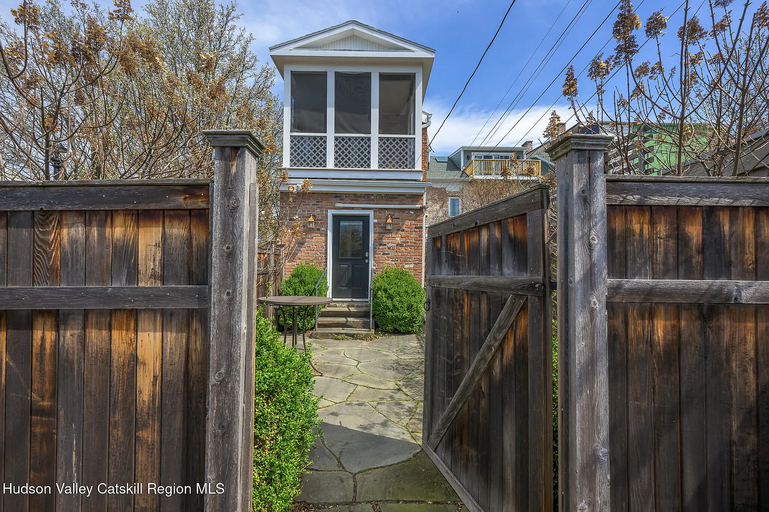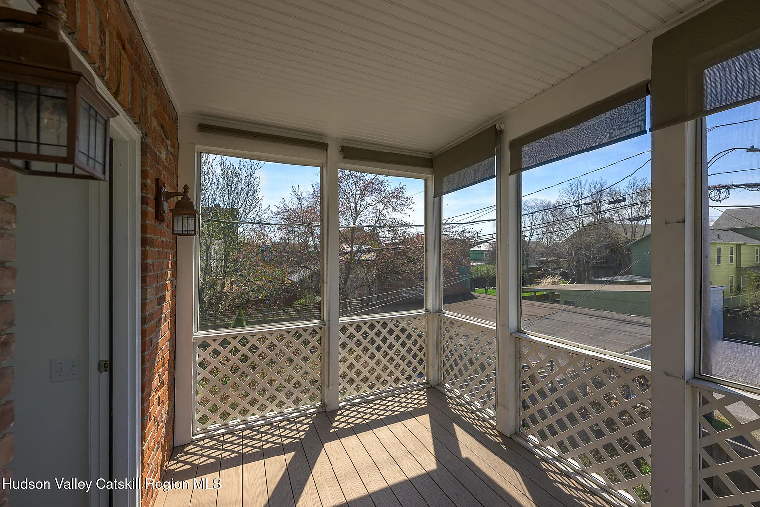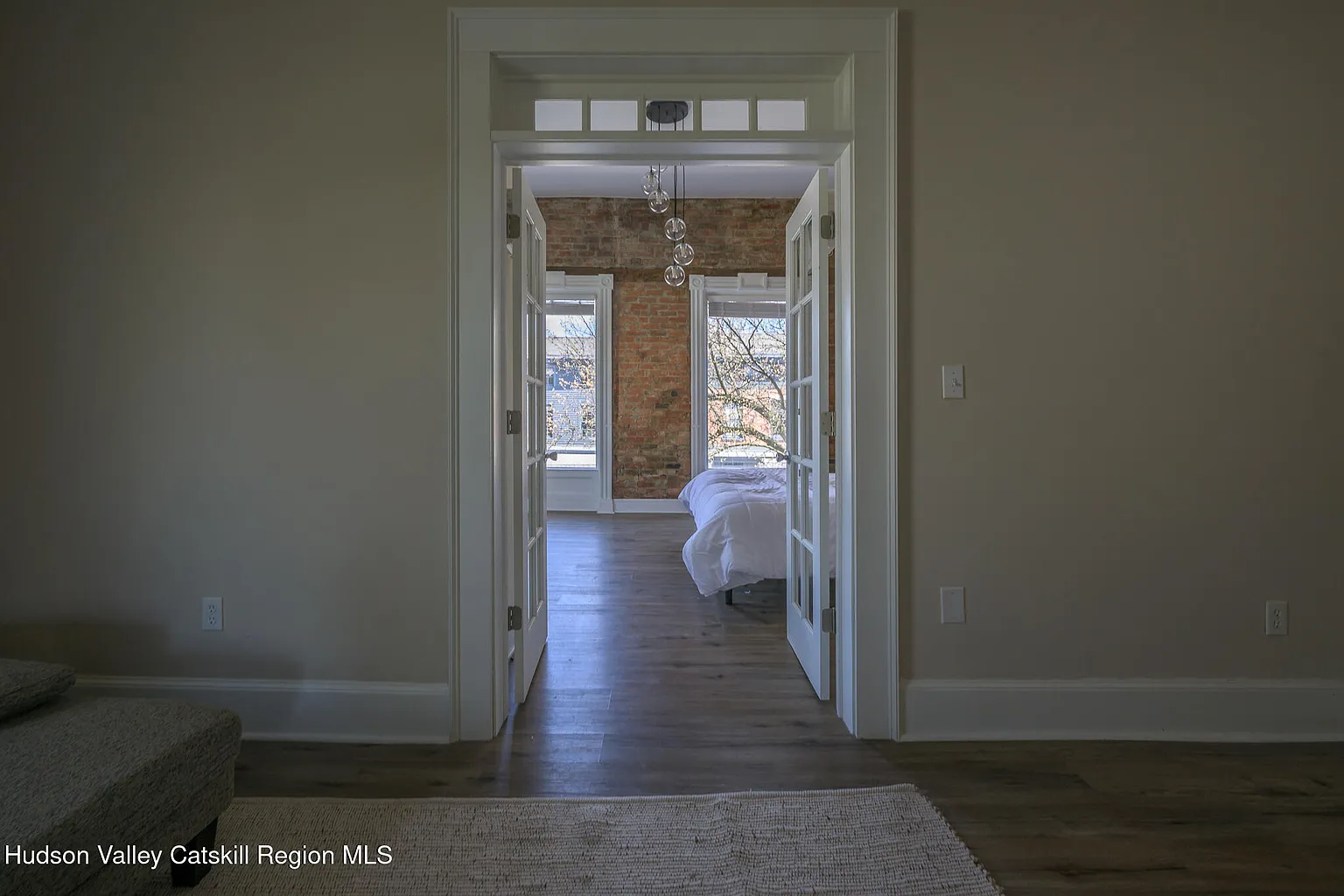 Up the stairs to the 2nd floor, one enters the dining and recreation areas of the apartment. The high ceilings and large windows fill the rooms with light and create a grand double reception, directly overlooking the neighboring park. The stunning brick exposures continue through to the large primary suite at the front. To the rear, one finds the bathroom, kitchen and 2nd bedroom complete with feature stone fireplace. This bedroom contains a laundry nook and opens directly on to the spacious screened deck with its views across the park, the historic houses on Union Street, and the mountains beyond – a perfect place to sit and admire the incredible Catskill sunsets.