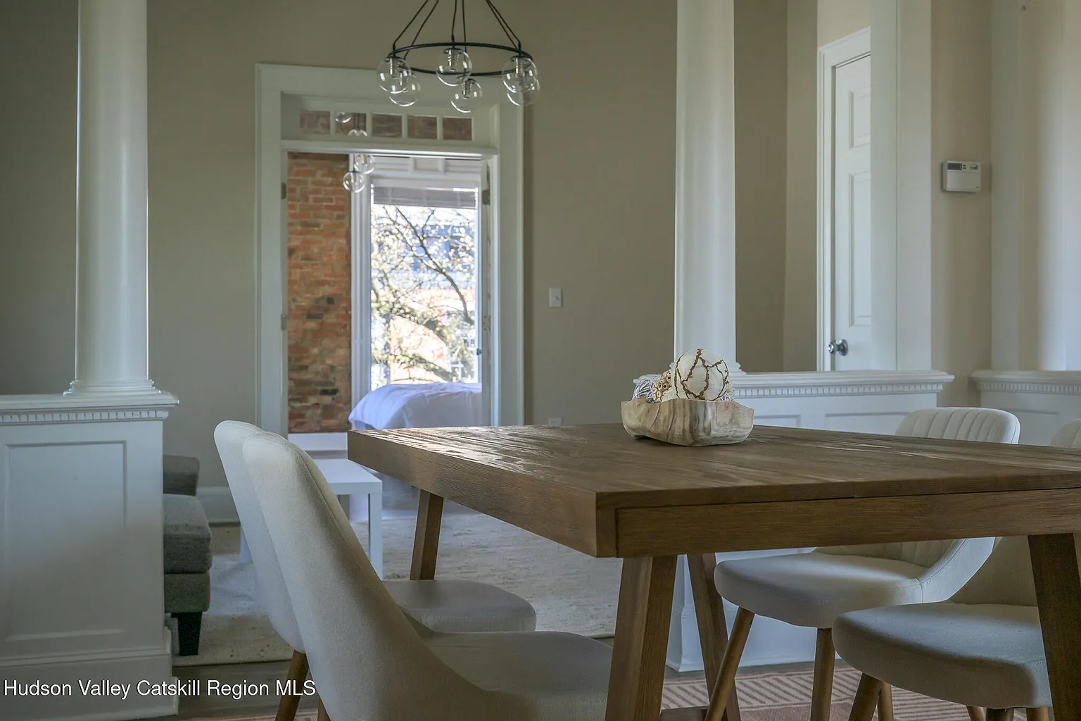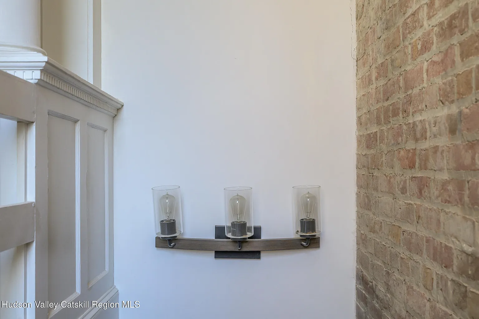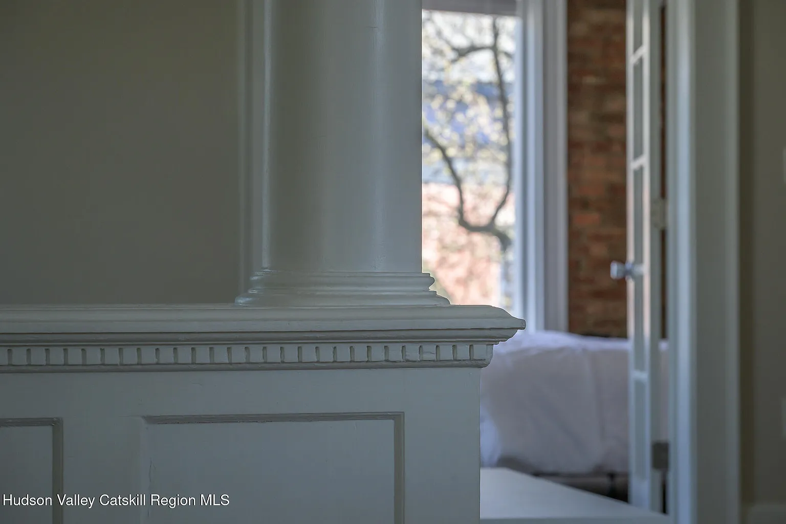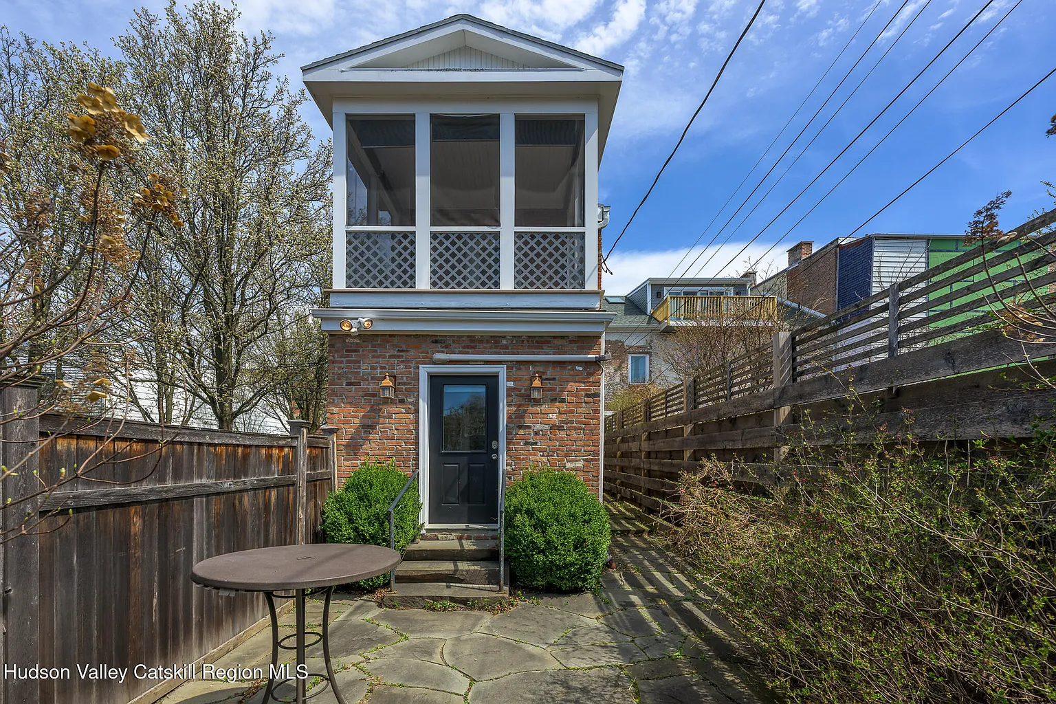 Up the stairs to the 2nd floor, one enters the dining and recreation areas of the apartment. The high ceilings and large windows fill the rooms with light and create a grand double reception, directly overlooking the neighboring park. The stunning brick exposures continue through to the large primary suite at the front. To the rear, one finds the bathroom, kitchen and 2nd bedroom complete with feature stone fireplace. This bedroom contains a laundry nook and opens directly on to the spacious screened deck with its views across the park, the historic houses on Union Street, and the mountains beyond – a perfect place to sit and admire the incredible Catskill sunsets.